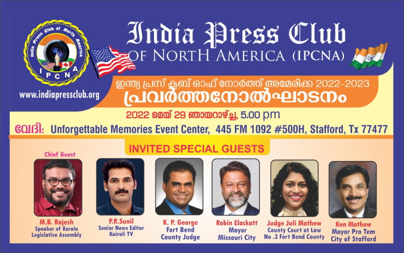 ഇന്ത്യ പ്രസ് ക്ലബ് ഓഫ് നോർത്ത് അമേരിക്ക ഹ്യൂസ്റ്റൺ ചാപ്റ്ററിന്റെ പ്രവർത്തനോത്ഘാടനവും സമ്മേളനത്തിൽ നടക്കും