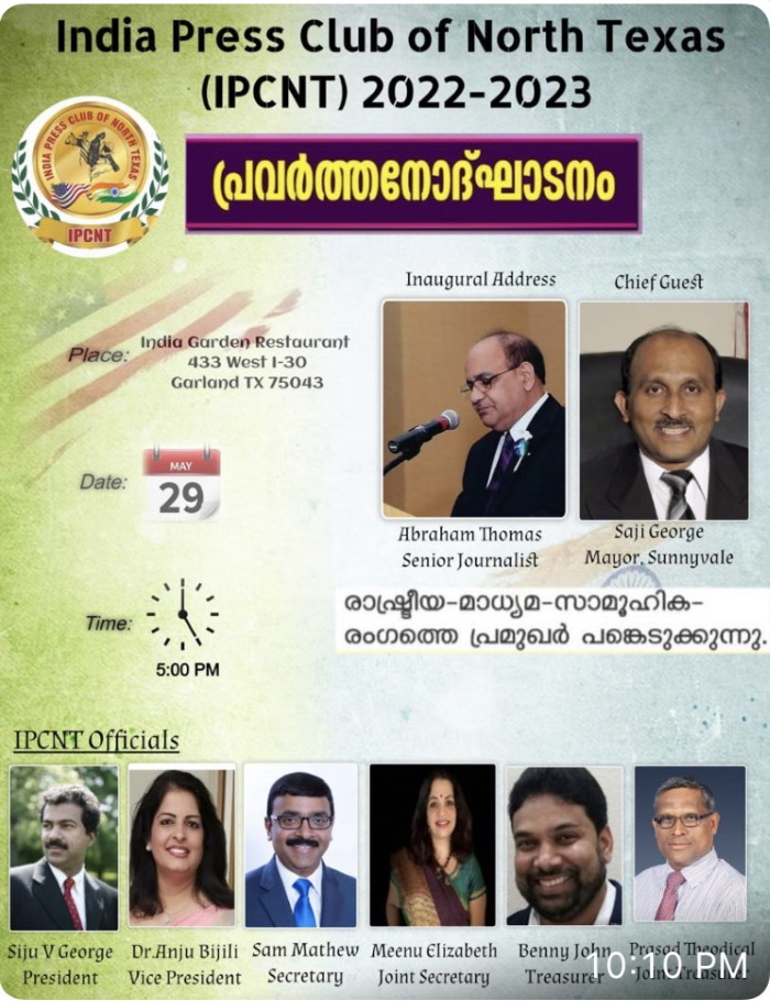 ഡാളസ്: നോർത്ത് അമേരിക്കയിലെ മലയാളി മാധ്യമ പ്രവർത്തകർ ഒത്തുചേർന്നു രജിസ്റ്റര് ചെയ്ത് ആദ്യമായി പ്രവർത്തനം ആരംഭിച്ച ഇന്ത്യാ പ്രസ് ക്ലബ് ഓഫ് നോർത്ത് ടെക്സസിന്റെ പൊതുയോഗം മെയ് 29 ഞായറാഴ്ച വൈകിട്ട് 5 മണിക്ക് ഗാർലന്റിലെ ഇന്ത്യ ഗാർഡൻ ഓഡിറ്റോറിയത്തിൽ വച്ച് നടക്കുന്നതാണ്. ഐ പി സി എൻ ടിയുടെ 2022-23 വർഷങ്ങളിലെ പ്രവർത്തന ഉദ്ഘാടനം സണ്ണിവെയിൽ സിറ്റി മേയറും മലയാളിയുമായ സജി ജോർജ് നിർവഹിക്കും. ഇന്ത്യാ പ്രസ് ക്ലബ് ഓഫ് നോർത്ത് ടെക്സസിന്റെ സ്ഥാപകാംഗവും അമേരിക്കയിലെ പ്രശസ്ത ജേർണലിസ്റ്റുമായ എബ്രഹാം തോമസ് യോഗത്തിൽ മുഖ്യപ്രഭാഷണം നടത്തും.