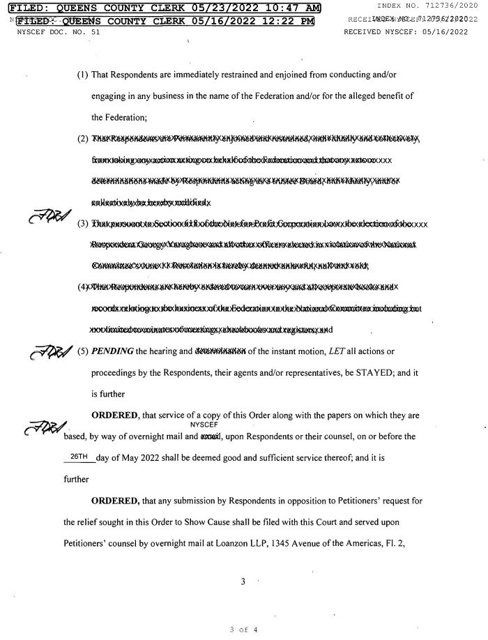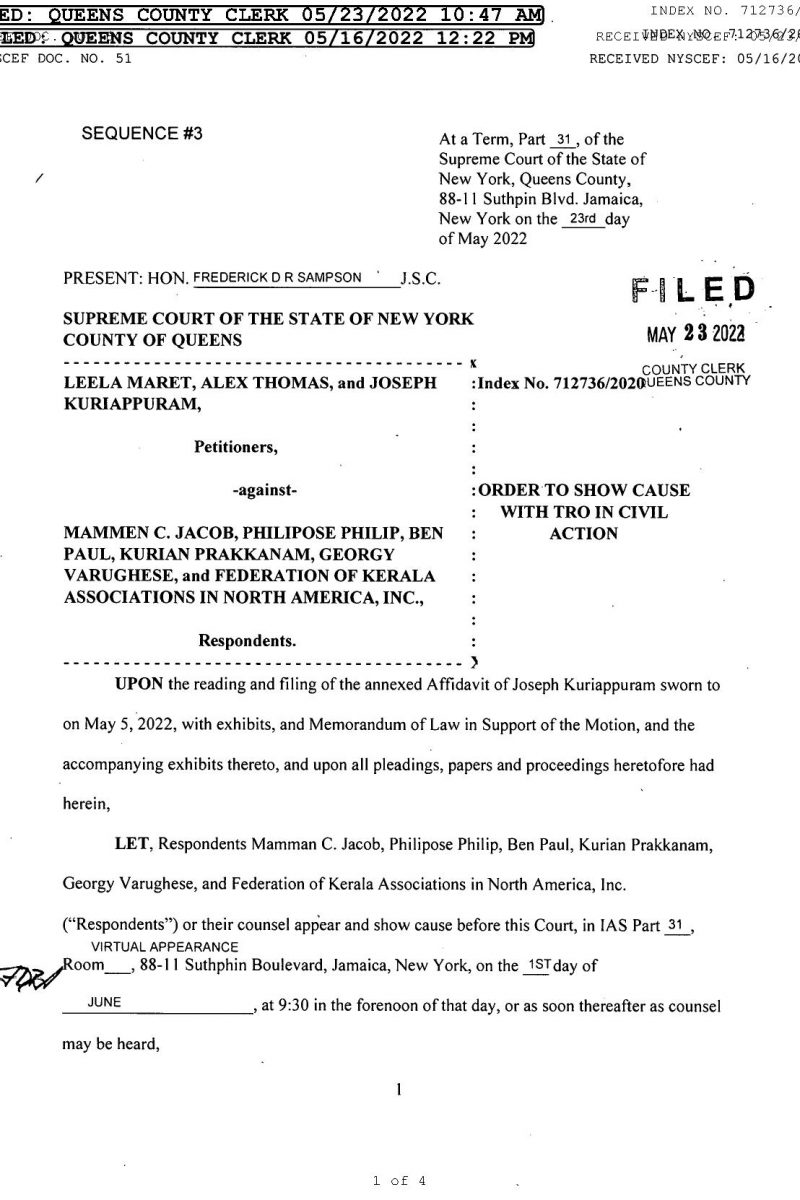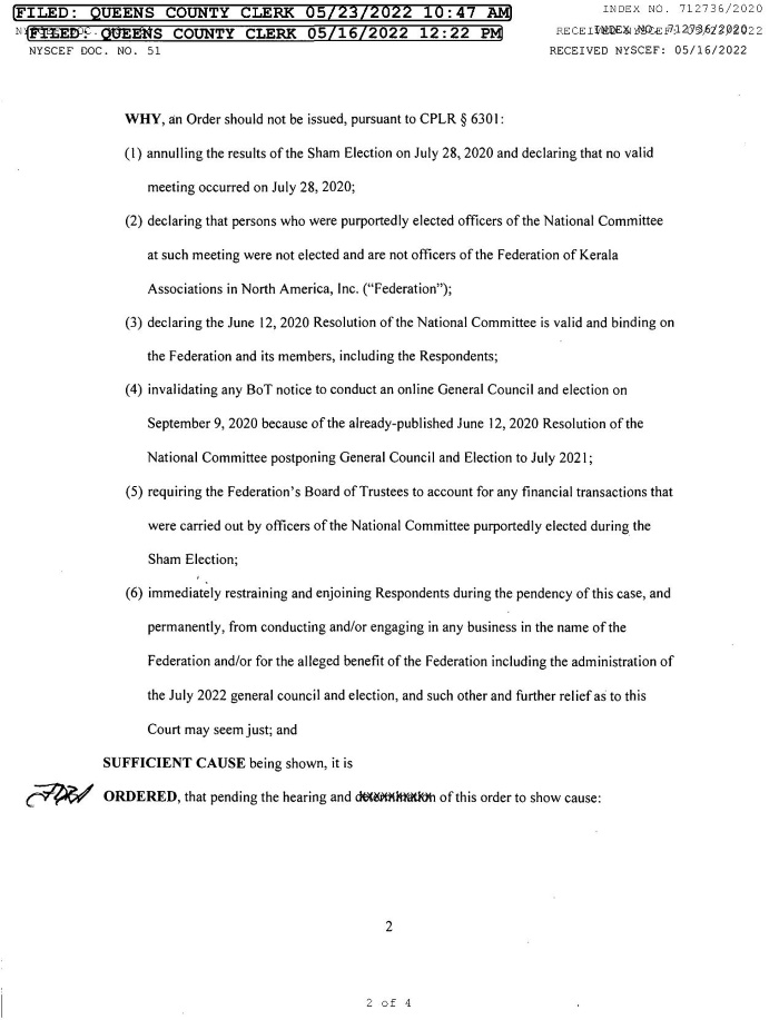 2020 ജൂണ് 12-ന് നാഷണല് കമ്മിറ്റി അംഗീകരിച്ച പ്രമേയം നിയമപരമായി സാധൂകരിക്കപ്പെടേണ്ടതാണെന്നും, 2020 ജൂലൈ 28-ന് നടന്ന തെരഞ്ഞെടുപ്പ് അനധികൃതമാണെന്നും, ആ തെരഞ്ഞെടുപില് വിജയിച്ചവരെ അയോഗ്യരാക്കണമെന്നും ചൂണ്ടിക്കാണിച്ച് ന്യൂയോർക്ക് ക്യൂൻസ് കൗണ്ടി കോടതിയില് ഫയല് ചെയ്ത കേസിന്റെ തുടര്ച്ചയാണ് ഇപ്പോഴത്തെ ഉത്തരവ്. 2020 ആഗസ്റ്റ് 12-ന് ക്വീന്സ് സുപ്രീം കോടതി പുറപ്പെടുവിച്ച നിയന്ത്രണാജ്ഞയ്ക്കെതിരെ (Restraining Order) എതിര്കക്ഷികള് മെരിലാൻഡ് ഫെഡറൽ കോടതിയില് അപ്പീലിനു പോകുകയും ചെയ്തു.