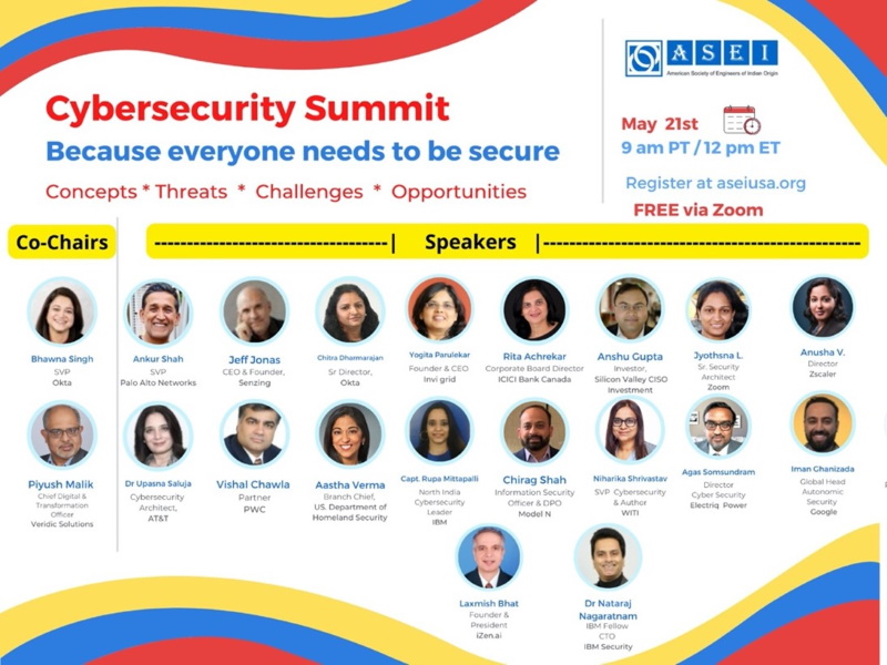 (Fremont, California) When it comes to cyber threats, one can’t always predict when one will occur. But one can prepare! The American Society of Engineers of Indian Origin (ASEI) hosted a virtual conference with 20 speakers on May 21st at the Cybersecurity Summit. The topic of cybersecurity with growing incidents of ransomware, malware, cyberwarfare and hacking raises a lot of eyebrows in our lives at personal as well as organizational levels and hence the underlying theme of the summit was “Because everyone needs to be secure.”