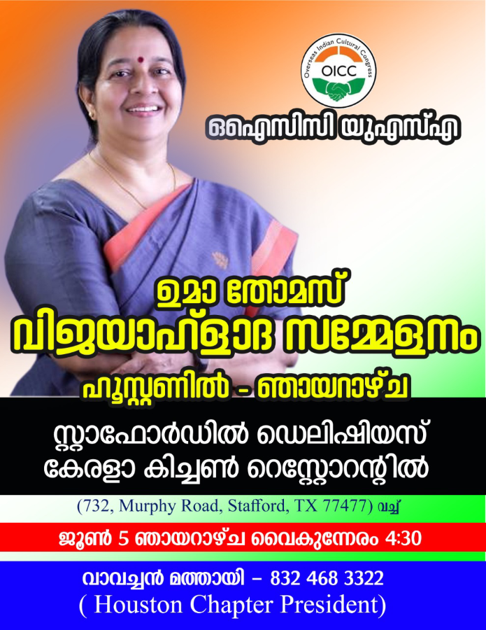 സ്റ്റാഫോർഡിൽ ഡെലിഷിയസ് കേരളാ കിച്ചൺ റെസ്റ്റോറന്റിൽ (732, Murphy Road, Stafford, TX 77477) വച്ച് ജൂൺ 5 ഞായറാഴ്ച വൈകുന്നേരം 4:30 നു ആരംഭിക്കുന്ന സമ്മേളനത്തിൽ ഹൂസ്റ്റണിലെ ഒഐസിസി യുഎസ്എ ചെയർമാൻ ജെയിംസ് കൂടൽ, പ്രസിഡണ്ട് ബേബി മണക്കുന്നേൽ, ജനറൽ സെക്രട്ടറി ജീമോൻ റാന്നി, മറ്റു കോൺഗ്രസ്, യുഡിഎഫ് നേതാക്കൾ, സാമൂഹ്യ സാംസ്കാരിക നേതാക്കൾ തുടങ്ങിയവർ സംബന്ധിക്കുന്നതാണ്.