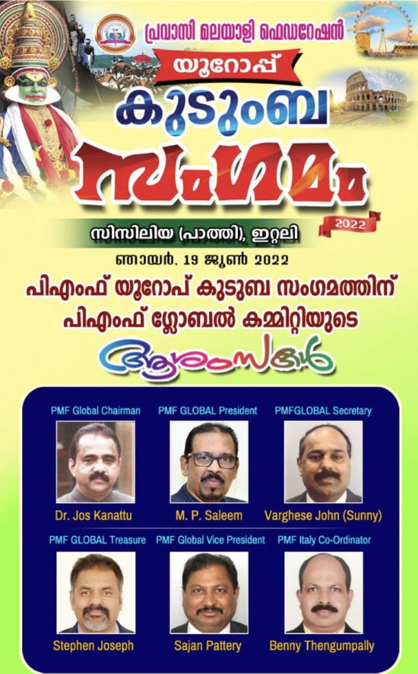യൂറോപ്പ് കുടുംബ സംഗമത്തിന് പി എം എഫ് ഗ്ലോബൽ കമ്മിറ്റി ഭാരവാഹികളായ എം പി സലീം പ്രസിഡണ്ട് ചെയർമാൻ ഡോക്ടർ ജോസ് കാനാട്ട് ,സെക്രട്ടറി വർഗീസ് ജോൺ, ട്രഷറർ സ്റ്റീഫൻ ജോസഫ്, വൈസ് പ്രസിഡണ്ട് സാജൻ പട്ടേരി എന്നിവർ ആശംസകൾ അറിയിച്ചു