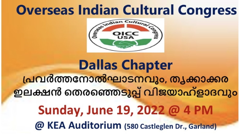 ഡാളസ് : ഓവര്സീസ് ഇന്ത്യന് കള്ച്ചറല് കോണ്ഗ്രസ് ഡാളസ് ചാപ്റ്റര് രൂപീകരിക്കുന്നതിനും, തൃക്കാക്കര ഉമാതോമസിന്റെ വിജയത്തില് ആഹ്ളാദം പങ്കുവയ്ക്കുന്നതിനും ജൂണ് 19 ഞായര് ഡാളസ്- ഫോര്ട്ട് വര്ത്തിലെ കോണ്ഗ്രസ് പ്രവര്ത്തകരുടെയും അനുഭാവികളുടെയും യോഗം ചേരുന്നു.