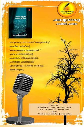 ഈ ശനിയാഴ്ച ( ജൂൺ 18 നു ) വൈകുന്നേരം 5.30 ന് 245014 Conrich Road Alberta T1Z 0B2 യിൽ നടക്കുന്ന ചടങ്ങിൽ ഷാഹിത റഫീഖ് എഴുതിയ “കനവുകളുടെ ഒറ്റത്തുരുത്ത്” എന്ന പുസ്തകത്തിന്റെ പ്രകാശനവും ഉണ്ടായിരിക്കും. കൂടാതെ മലയാള സിനിമയിൽ സംഗീത സംവിധാനത്തിൽ സാന്നിധ്യം അറിയിച്ച കണ്ണൻ C.J, ലോകോത്തര ഫോട്ടോഗ്രാഫി മാഗസിനുകളിൽ കവർ പേജുകളിൽ മുദ്ര പതിപ്പിച്ച റോഡിയ തയ്യിൽ ജോസ് എന്നിവരെയും കാവ്യസന്ധ്യ ഈ അവസരത്തിൽ ആദരിയ്ക്കുന്നതാണ്.
