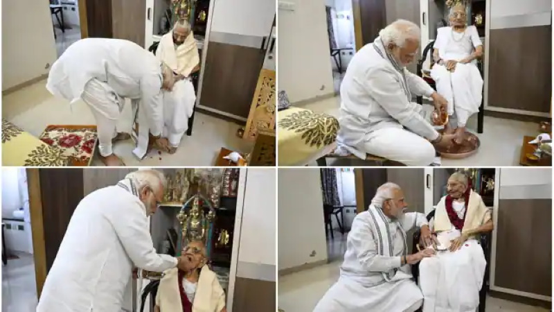 പാദങ്ങൾ കഴുകി, കാൽക്കൽ ഇരുന്ന് ഒരുമിച്ച് പൂജ നടത്തി; അമ്മയുടെ നൂറാം ജന്മദിനത്തിൽ പ്രധാനമന്ത്രി മോദി വീട്ടിലെത്തി