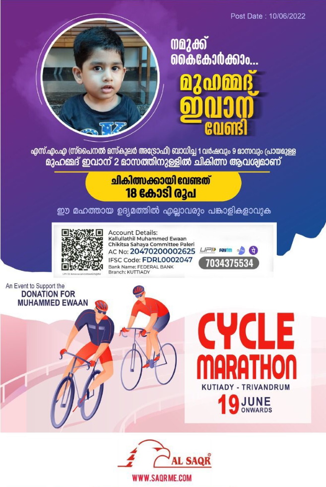 ആദിൽ, ഫാസിൽ, മുഹമ്മദ്, ഷംനാദ്, നബോർ എന്നിവരാണ് 400 കിലോമീറ്റർ യാത്ര ചെയ്ത് പണം സമാഹരിക്കാൻ സൈക്കിൾ യാത്ര നടത്തുന്നത്. 18 കോടി രൂപയാണ് ഒന്നരവയസുകാരന് ഇവാന്റെ ചികിത്സയ്ക്ക് കണ്ടെത്തേണ്ടത്. ഇവാൻ്റെ ചിത്രം പതിച്ച ടീ ഷർട്ടാണ് പ്രചാരണത്തിൻ്റെ ഭാഗമായി ഈ ടീം ധരിച്ചിരിക്കുന്നത്. കടന്നുപോകുന്ന വഴികളിൽ മുന്നോടിയായി പ്രചാരണ വാഹനവും ഉണ്ടാവും.