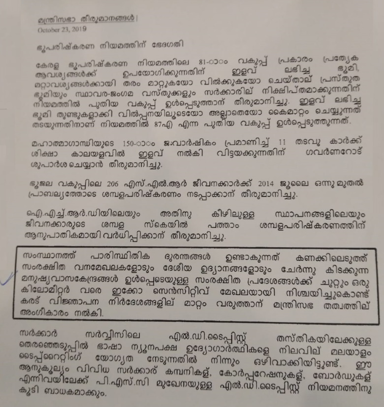 സംസ്ഥാനത്ത് പാരിസ്ഥിതിക ദുരന്തങ്ങള് ഉണ്ടാകുന്നത് കണക്കിലെടുത്ത് സംരക്ഷിത വനമേഖലകളോടും ദേശീയ ഉദ്യാനങ്ങളോടും ചേര്ന്നുകിടക്കുന്ന മനുഷ്യവാസകേന്ദ്രങ്ങള് ഉള്പ്പെടെയുള്ള സംരക്ഷിത പ്രദേശങ്ങള്ക്ക് ചുറ്റും ഒരു കിലോമീറ്റര് വരെ ഇക്കോ സെന്സിറ്റീവ് മേഖലയായി നിശ്ചയിച്ചുകൊണ്ട് കരട് വിജ്ഞാപന നിര്ദ്ദേശങ്ങളില് മാറ്റം വരുത്താന് മന്ത്രിസഭയെടുത്ത തീരുമാനം നിലനില്ക്കുമ്പോള് സംസ്ഥാന സര്ക്കാര് ഇപ്പോള് നടത്തുന്ന നീക്കങ്ങള് ഗുണം ചെയ്യില്ല. ഈ തീരുമാനം ഉയര്ത്തിപ്പിടിച്ച് പരിസ്ഥിതിമൗലികവാദ സംഘടനകള് കോടതിയെ സമീപിക്കാനുള്ള നീക്കങ്ങള് അണിയറയിലുണ്ട്. എന്നാല് ഈ മന്ത്രിസഭാതീരുമാനം കൊച്ചിനഗരത്തിലെ മംഗളവനത്തിലും നടപ്പാക്കിയാല് വന്കിട നഗരവാസികള്ക്കുണ്ടാകുന്ന ഭവിഷ്യത്തുകള് തിരിച്ചറിഞ്ഞതുകൊണ്ടാണ് പൂജ്യം മുതല് ഒരു കിലോമീറ്റര് വരെ ബഫര്സോണ് എന്ന് പിന്നീട് തിരുത്തിയതും കേന്ദ്രസര്ക്കാരിന് റിപ്പോര്ട്ട് കൈമാറിയതും.