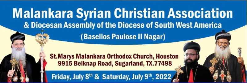 മലങ്കര ഓർത്തോഡോക്സ് സുറിയാനി സഭ മലങ്കര അസ്സോസ്സിയേഷൻ യോഗവും സൗത്ത് വെസ്റ്റ്അമേരിക്കൻ ഭദ്രാസന അസംബ്ലിയും ജൂലൈ 8-9 (വെള്ളി, ശനി) തീയതികളിൽ ഹൂസ്റ്റൺ സെൻറ്മേരീസ് ഓർത്തോഡോക്സ് ദേവാലയത്തിൽ നടക്കും. മലങ്കര മെത്രാപ്പോലീത്തായുംകാതോലിക്കയുമായ പരിശുദ്ധ ബസേലിയോസ് മാർത്തോമാ മാത്യൂസ് തൃതീയൻ കാതോലിക്കാബാവായുടെ 47/ 2022 കൽപ്പനപ്രകാരം സൗത്ത് വെസ്റ്റ് അമേരിക്കൻ ഭദ്രാസനത്തിലെ 55 ദേവാലയങ്ങളിൽ നിന്നായി 1934 -ലെ ഭരണഘടനപ്രകാരം ഇടവകപൊതുയോഗം തെരെഞ്ഞെടുത്തവൈദീകരും, അൽമായ പ്രതിനിധികളും വിവിധ യോഗങ്ങളിൽ സംബന്ധിക്കും. നോർത്ത് ഈസ്ററ്അമേരിക്കൻ ഭദ്രാസന മെത്രാപോലീത്ത അഭിവന്ദ്യ സഖറിയാ മാർ നിക്കോളോവോസ് മലങ്കരമെത്രാപ്പോലീത്താക്കുവേണ്ടി പ്രത്യേക കൽപ്പനപ്രകാരം യോഗത്തിൽ അദ്ധ്യക്ഷത വഹിക്കും.