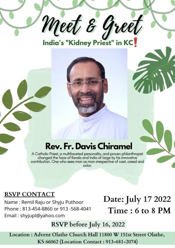 സ്വന്തം വൃക്ക അപരിചിതനായ ഒരു വ്യക്തിക്ക് ധാനം ചെയ്തു അവയവദാനത്തിൻറെ മഹത്വം ലോകത്തിന് കാണിച്ചുകൊടുത്ത ബഹുമാനപ്പെട്ട ഡേവിഡ് ചിറമേൽ അച്ചനെ നേരിൽ കാണുവാനും കേൾക്കുവാനും അമേരിക്കൻ മലയാളികൾക്ക് ഒരു സുവർണാവസരം