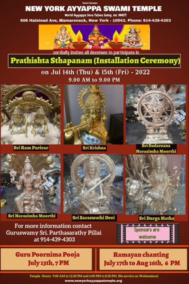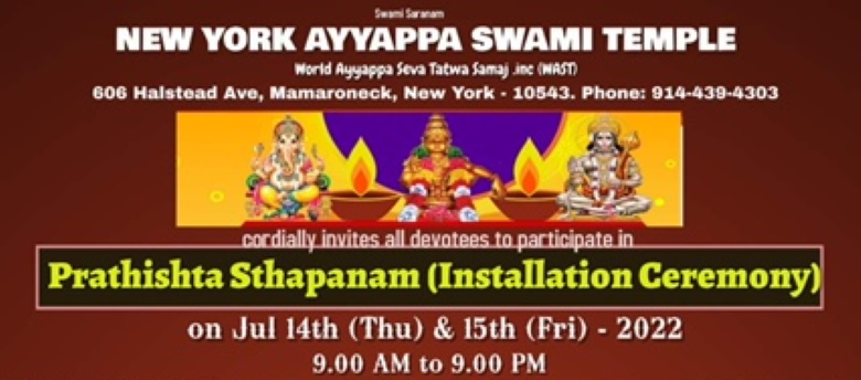 വെസ്റ്റ് ചെസ്റ്റർ അയ്യപ്പ ക്ഷേത്രത്തിൽ (606 Halstead Ave, Mamaroneck , NY 10543) പ്രതിഷ്ഠ കർമ്മത്തിലേക്കും എല്ലാ ഭക്തരെയും സ്വാഗതം ചെയ്യുന്നതായി ക്ഷേത്രം പ്രസിഡന്റ് പാർത്ഥസാരഥി പിള്ളയും ക്ഷേത്ര കമ്മറ്റി അറിയിച്ചു.