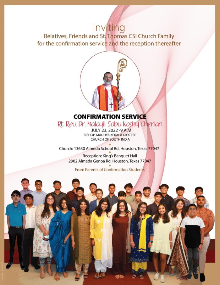 ജൂലൈ 23 ശനിയാഴ്ച രാവിലെ 9 മണിക്ക് സെന്റ് തോമസ് സിഎസ്ഐ ദേവാലയത്തിൽ (13630, Almeda Genoa Rd, housotn, Texas 77047) ആരംഭിക്കുന്ന വിശുദ്ധ സംസർഗ ശുശ്രൂഷയ്ക്ക് അഭിവന്ദ്യ തിരുമേനി മുഖ്യ കാർമ്മികത്വം വഹിയ്ക്കും. ഇടവകയിലെ 28 യുവജനങ്ങളുടെ സ്ഥിരീകരണ ശുശ്രൂഷയ്ക്കും (ആദ്യ കുർബാന) തിരുമേനി നേതൃത്വം നൽകും.