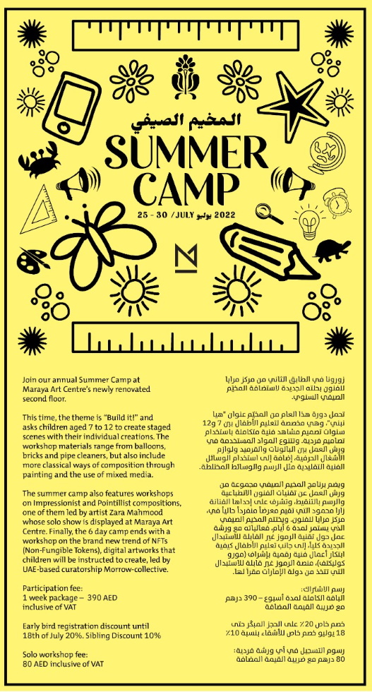 ജൂലൈ 25 മുതൽ 30 വരെയായി ആറു ദിവസം നീണ്ടുനിൽക്കുന്ന ക്യാംപിന്റെ സമയക്രമം രാവിലെ 10.30 മുതൽ ഉച്ചയ്ക്ക് 1.30 വരെയാണ്. ഷാർജ അൽ ഖസ്ബയിലുള്ള മരായ ആർട് സെന്ററാണ് വേദി.