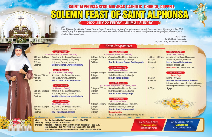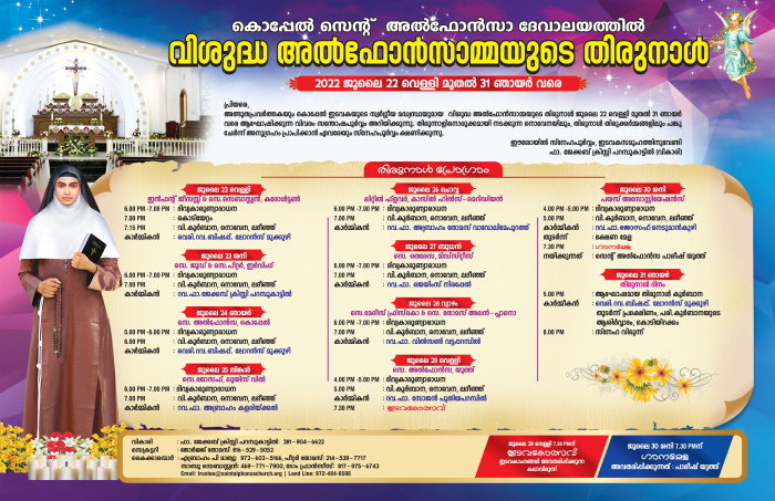 കൊപ്പേൽ (ടെക്സാസ്) : ഭാരതത്തിന്‍റെ പ്രഥമ വിശുദ്ധയായ വി. അല്‍ഫോന്‍സാമ്മയുടെ തിരുനാളിനു കൊപ്പേല്‍ സെന്റ് അല്‍ഫോന്‍സാ ദേവാലയത്തില്‍ ജൂലൈ 22 (വെള്ളി) അഭിവന്ദ്യ ബിഷപ്പ് മാർ ലോറൻസ് മുക്കുഴി കൊടിയേറ്റുന്നതോടെ തുടക്കമാവും . ജൂലൈ 22 മുതല്‍ 31 വരെയാണ് തിരുനാൾ. ജൂലൈ 31 ഞായറാഴ്ച നടക്കുന്ന ആഘോഷമായ തിരുനാൾ കുർബാനക്കു അഭി. ബിഷപ്പ് മാർ ലോറൻസ് മുക്കുഴി മുഖ്യകാർമ്മികത്വം വഹിക്കും. തിരുനാൾ ആഘോഷങ്ങൾക്ക് ഇടവക വികാരി ഫാ. ജേക്കബ് ക്രിസ്റ്റി പറമ്പുകാട്ടിൽ , കൈക്കാരന്മാരായ എബ്രഹാം പി മാത്യൂ , പീറ്റർ തോമസ് , സാബു സെബാസ്റ്റ്യൻ , ടോം ഫ്രാൻസീസ്, ജോർജ് തോമസ് (സെക്രട്ടറി) എന്നിവരടങ്ങുന്ന പാരീഷ് കൌണ്‍സിലും ഇടവകയിലെ കുടുംബ യൂണിറ്റുകളും നേതൃത്വം നൽകും.
