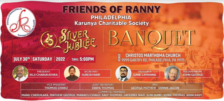 ഫിലഡല്ഫിയ: ചരിത്ര നഗരിയായ ഫിലഡല്ഫിയയ്ക്ക് തിലകക്കുറിയായി പ്രവര്ത്തിക്കുന്ന പ്രമുഖ കലാ-സാംസ്കാരിക-ജീവകാരുണ്യ സംഘടനയായ ഫ്രണ്ട്സ് ഓഫ് റാന്നിയുടെ ഇരുപത്തഞ്ചാം വാര്ഷികം (സില്വര്ജൂബിലി) 2022 ജൂലൈ 30-ന് ക്രിസ്തോസ് മാര്ത്തോമാ ചര്ച്ചിന്റെ കമനീയമായ ഓഡിറ്റോറിയത്തില് വച്ചു (999 ഗാന്റോയി റോഡ്, ഫിലഡല്ഫിയ, പി.എ 19115) നടത്തുന്നു.