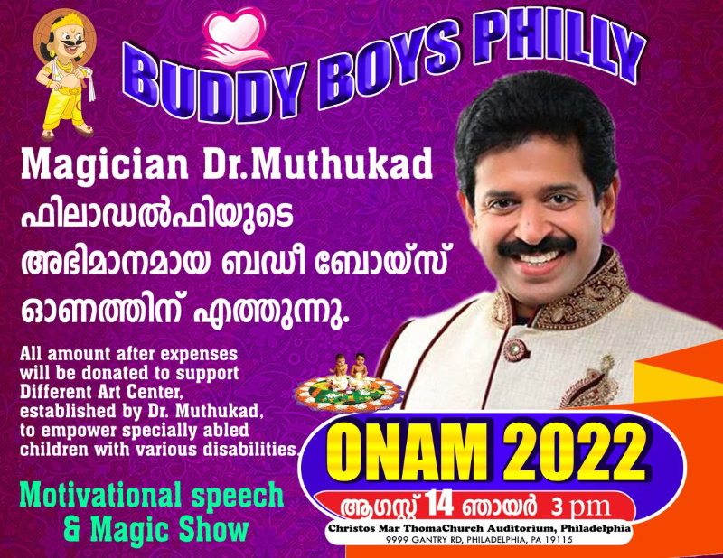 ലോക പ്രശസ്ത മന്ത്രികനും, കേരളത്തിലെ ഏറ്റവും ജനകീയനായ ഇന്ദ്രജാലക്കാരനും, മോട്ടിവേഷണൽ സ്പീക്കറും, നൂറുകണക്കിന് ഭിന്നശേഷിക്കാരായ കുട്ടികളുടെ ആശയും ആവേശവും അഭയസ്ഥാനവുമായി നിലകൊള്ളുന്ന അന്താരാഷ്ട്ര നിലവാരത്തിലുള്ള ഏഷ്യയിലെ ആദ്യത്തെ മാജിക് തീം മ്യൂസിയമായ മാജിക് പ്ലാനറ്റിന്റെ ഉടമയുമായ പ്രൊഫ. ഗോപിനാഥ് മുതുകാട് ഫിലാഡൽഫിയ മലയാളികളുടെ അഭിമാനമായ ബഡ്ഡി ബോയ്സ് ഓണാഘോഷത്തിന് മുഖ്യാതിഥിയായി പങ്കെടുത്ത് ഓണസന്ദേശം നൽകും.