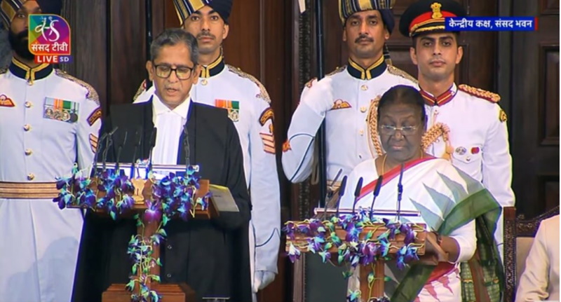 സ്ഥാനമൊഴിയുന്ന രാഷ്ട്രപതി രാംനാഥ് കോവിന്ദും മുർമുവും സത്യപ്രതിജ്ഞ ആരംഭിക്കുന്നതിന് തൊട്ടുമുമ്പ് ആചാരപരമായ ഘോഷയാത്രയിൽ പാർലമെന്റിലെത്തി.