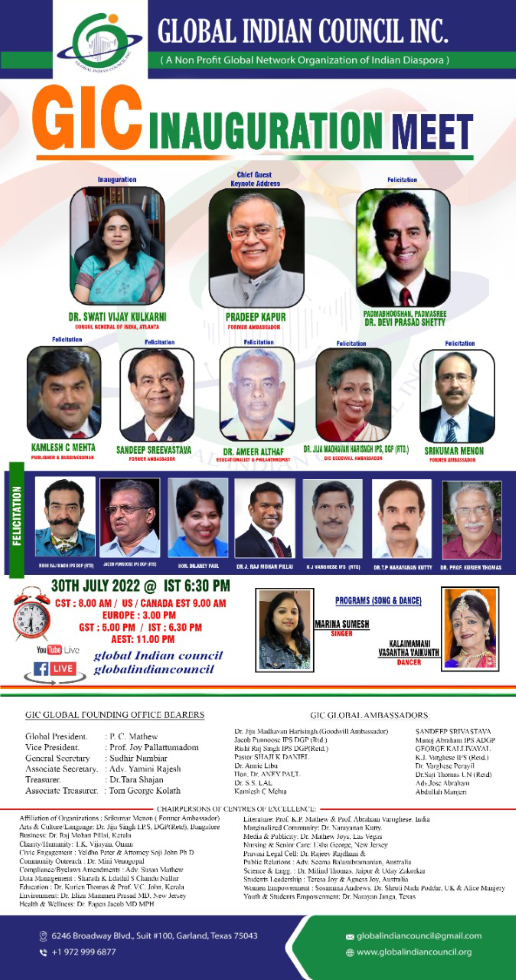 വിവിധ രാജ്യങ്ങളിൽ നിന്നുള്ള ഗ്ലോബൽ ഇന്ത്യൻ കൗൺസിലിന്റെ സ്ഥാപക അംഗങ്ങൾ 2022 ജൂലൈ 30 ശനിയാഴ്ച സൂം പ്ലാറ്റ്ഫോമിൽ യോഗം ചേരും. ക്ഷണിക്കപ്പെട്ട അതിഥികളെ ഗ്ലോബൽ ജനറൽ സെക്രട്ടറി ശ്രീധർ നമ്പ്യാർ സ്വാഗതം ചെയ്യും , ഗ്ലോബൽ പ്രസിഡന്റ് പി.സി. മാത്യു അധ്യക്ഷ പ്രസംഗം നടത്തും.
