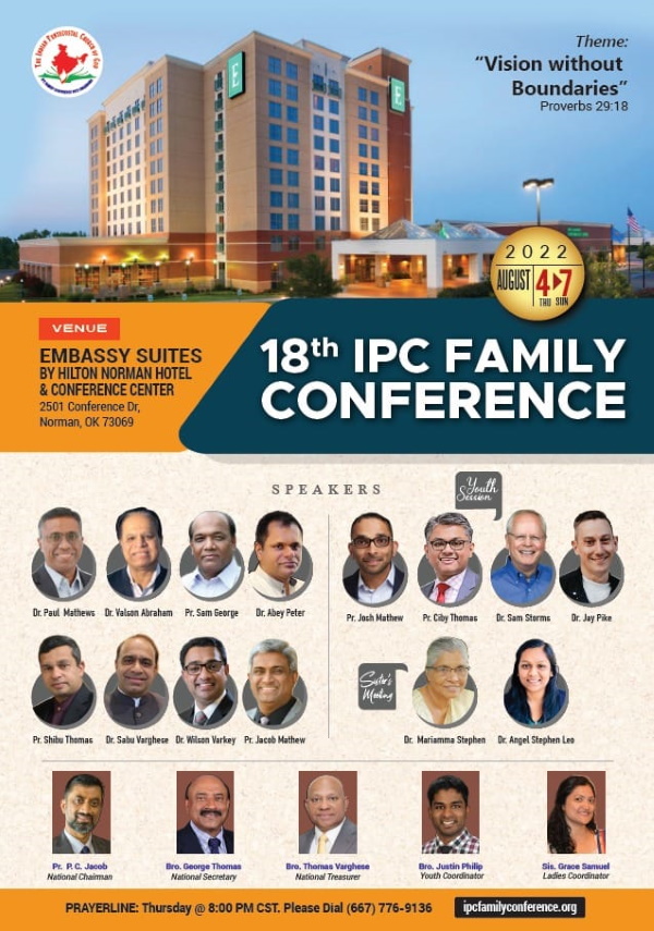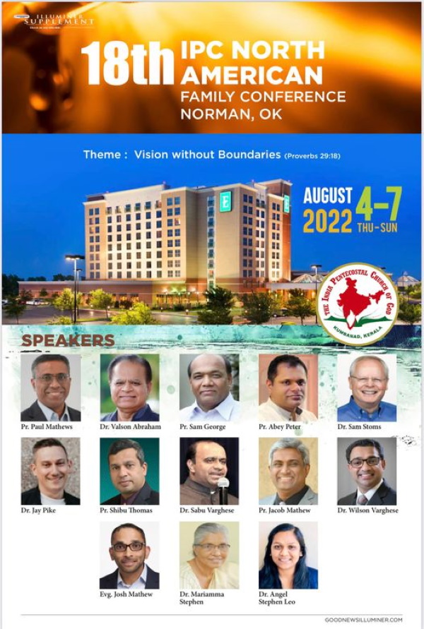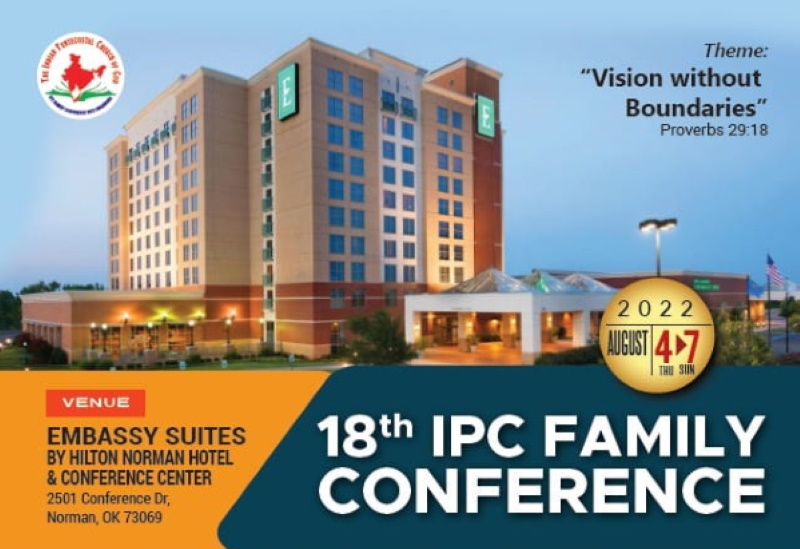 ഒക്കലഹോമ : ഇൻഡ്യാ പെന്തക്കോസ്ത് ദൈവസഭ 18 മത് നോർത്തമേരിക്കൻ കോൺഫ്രൻസിന്റെ വിജയകരമായ നടത്തിപ്പിനായുള്ള ഒരുക്കങ്ങൾ അവസാനഘട്ടത്തിൽ. ആഗസ്റ്റ് 4 മുതൽ 7 വരെ ഒക്കലഹോമയിൽ നോർമൻ എംബസി സ്യൂട്ട് ഹോട്ടലിൽ വെച്ചാണ് കോൺഫ്രൻസ് നടത്തപ്പെടുക.