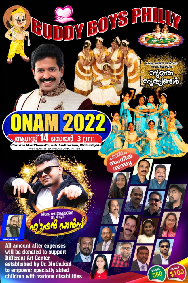 പ്രൊഫഷണൽ ടീമുകൾ അണിയിച്ചൊരുക്കുന്ന വത്യസ്ത പരിപാടികളുടെ വർണ്ണവിസ്മയങ്ങൾ തീർക്കുന്ന ഓണാഘോഷ പരിപാടികൾ 2022 ഓഗസ്റ്റ് 14ന് ഞായറാഴ്ച വൈകിട്ട് മൂന്ന് മണി മുതല് ഫിലഡല്ഫിയാ ക്രിസ്തോസ് മാര്ത്തമാ ചര്ച്ച് ഓഡിറ്റോറിയത്തില് വച്ചാണ് (9999 Gatnry Road ,Philadelphia, PA 19115 ) നടത്തപ്പെടുന്നത്. പ്രവേശനം പാസ്സ് മൂലം നിയന്ത്രിക്കും.