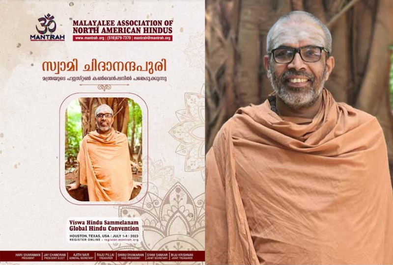 ഹ്യൂസ്റ്റണ്: കേരളത്തിലെ സമകാലിക സന്യാസ വര്യൻന്മാരിൽ സമാദരണീയനായ ,സനാതന മൂല്യങ്ങളില് അധിഷ്ഠിതമായ ആര്ഷ ഭാരത സംസ്കാരത്തിന്റെ ആഴവും പരപ്പും ഒട്ടും ചോരാതെ വിശ്വാസികളിലേക്ക് വളരെ ലളിതമായി തന്റെ സ്വതസിദ്ധമായ വാഗ്ധോരണിയിലൂടെ സന്നിവേശിപ്പിക്കുന്ന കൊളത്തൂര് അദ്വൈതാശ്രമം മഠാധിപതി സ്വാമി ചിദാനന്ദപുരി 2023 ജൂലൈയില് ഹ്യൂസ്റ്റണിൽ നടക്കുന്ന മന്ത്രയുടെ വിശ്വ ഹിന്ദു സമ്മേളനത്തിൽ പങ്കെടുക്കുന്നു. മന്ത്ര ട്രസ്റ്റീ വൈസ് ചെയർ മധു പിള്ള, ഡയറക്ടർ ബോർഡ് അംഗം കൃഷ്ണരാജ് മോഹനൻ എന്നിവർ കൊളത്തൂർ ആശ്രമത്തിലെത്തി അദ്ദേഹത്തെ ക്ഷണിച്ചു.