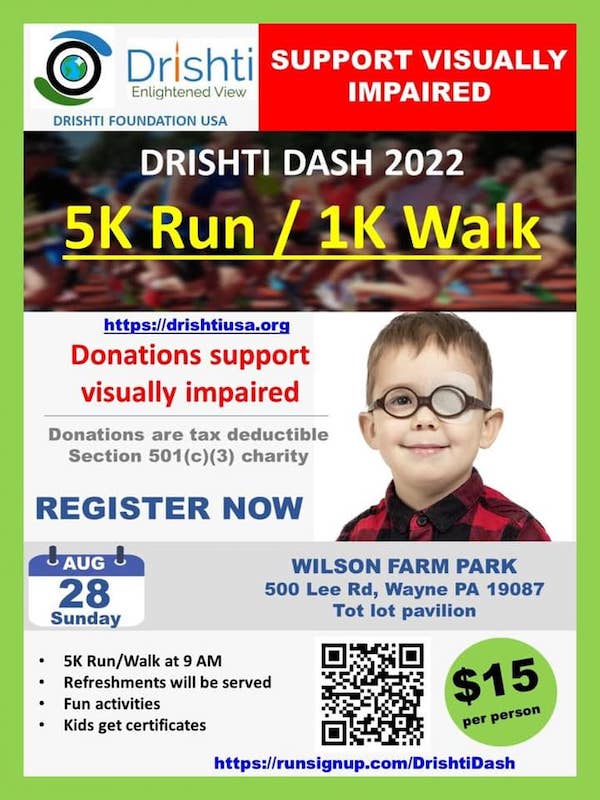 പെന്സില്വാനിയ: പെൻസിൽവാനിയ ആസ്ഥാനമായുള്ള ചാരിറ്റി സംഘടനയായ “ദൃഷ്ടി ഫൗണ്ടേഷൻ”, ലോകമെമ്പാടുമുള്ള അന്ധവിദ്യാലയങ്ങളിലെ കുട്ടികളെ പിന്തുണയ്ക്കുന്നതിനായി ഓഗസ്റ്റ് 28 ഞായറാഴ്ച, പെൻസിൽവാനിയയിലെ വെയ്നിൽ 5K അല്ലെങ്കിൽ 1K ഓട്ടം/നടത്തം സംഘടിപ്പിക്കുന്നു.