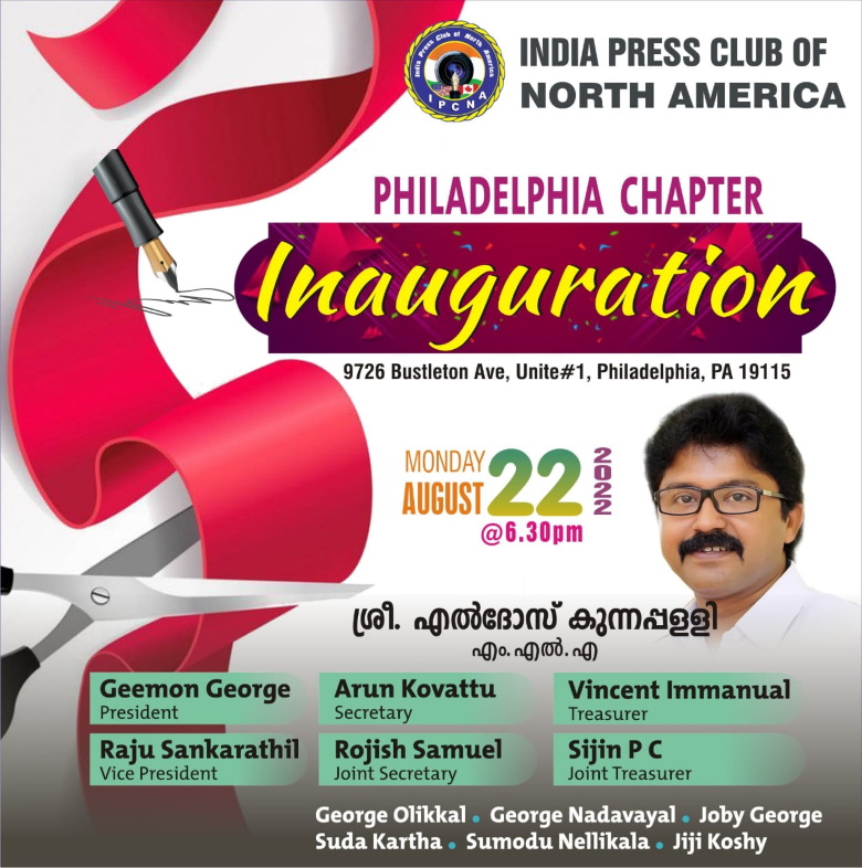 ഫിലഡൽഫിയ: സാഹോദരീയ പട്ടണമായ ഫിലാഡൽഫിയായിലെ മലയാളികളുടെ സംഘടനാപരമായും സാമൂഹിക പരമായും ഉണ്ടായിട്ടുള്ള ഉയർച്ചക്ക് എന്നും പിന്തുണ നൽകിയിട്ടുള്ള മാധ്യമപ്രവർത്തകരുടെ കൂട്ടായ്മയായ ഇന്ത്യ പ്രസ് ക്ലബ് ഓഫ് നോർത്ത് അമേരിക്കയുടെ ഫിലഡൽഫിയ ചാപ്റ്ററിന്റെ പ്രവർത്തനോദ്ഘാടനം ഓഗസ്റ്റ് 22 ന് തിങ്കളാഴ്ച വൈകിട്ട് 6 :30 ന് പമ്പ മലയാളി അസോസിയേഷന്റെ ഹാളിൽ വച്ച് പെരുമ്പാവൂര് എം എല് എ എല്ദോസ് കുന്നപ്പള്ളി നിർവ്വഹിക്കും (9726 Bustleton Ave, UNIT #1, Philadelphia, PA 19115) .