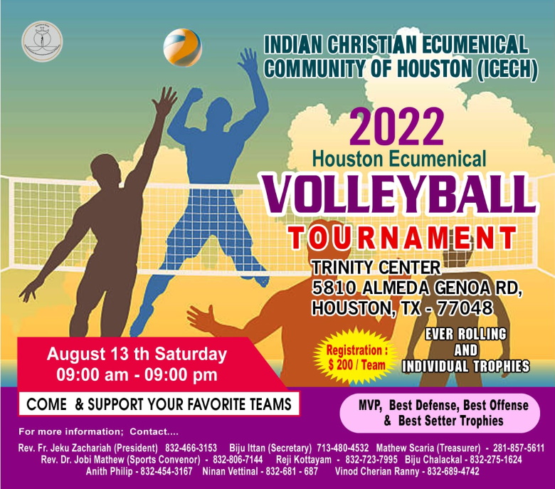 ഓഗസ്റ്റ് 13 ശനിയാഴ്ച രാവിലെ 9 മുതൽ രാത്രി 9 വരെ നടക്കുന്ന ടൂർണമെന്റിൽ ഹൂസ്റ്റണിലെ വിവിധ ഇടവകകളിൽ നിന്നുള്ള ടീമുകൾ പങ്കെടുക്കും. ട്രിനിറ്റി സെന്ററിൽ (5810,Almeda Genoa Road, Hoston, TX 77048) വച്ച് നടക്കുന്ന ടൂർണമെന്റ് വിജയിപ്പിയ്ക്കുന്നതിനു എല്ലാ കായിക പ്രേമികളെയും ട്രിനിറ്റി സെന്ററിലേക്ക് ക്ഷണിക്കുന്നവെന്നു സംഘടകർ അറിയിച്ചു, വിജയികൾക്ക് ചാമ്പ്യൻഷിപ്പ് ട്രോഫികളും എംവിപി, ബസ്റ്റ് ഡിഫെൻസ്, ബസ്റ്റ് ഒഫൻസ്, ബെസ്റ്റ് സെറ്റ്ലെർ തുടങ്ങിയ വ്യക്തിഗത ട്രോഫികളും ലഭിക്കും.
