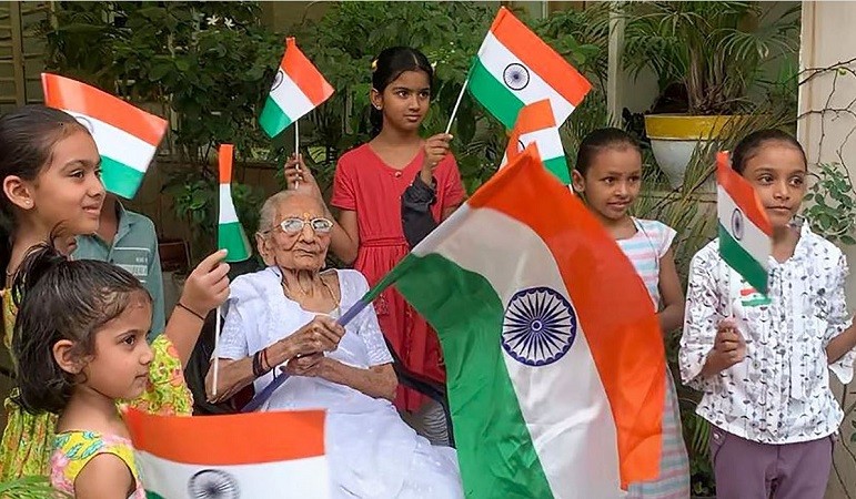 അഹമ്മദാബാദ്: ഈ വർഷം ജൂണിൽ 100 വയസ്സ് തികഞ്ഞ യുന്ന പ്രധാനമന്ത്രി നരേന്ദ്ര മോദിയുടെ അമ്മ ഹീരാബെന് ഗുജറാത്തിലെ ഗാന്ധിനഗർ നഗരത്തിന്റെ പ്രാന്തപ്രദേശത്തുള്ള വീട്ടിൽ ശനിയാഴ്ച കുട്ടികൾക്ക് ദേശീയ പതാക വിതരണം ചെയ്തു.