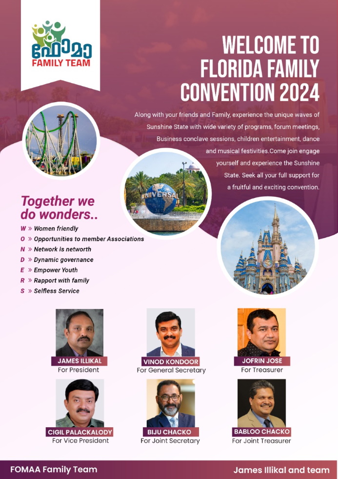 ജെയിംസ് ഇല്ലിക്കലിൻറെ നേതൃത്വത്തിലുള്ള “ഫോമാ ഫാമിലി ടീം” 2024-ലെ ഫാമിലി കൺവെൻഷൻ ഫ്ലോറിഡയിലെ ഡിസ്നി വേൾഡിന്റെ മാസ്മരിക ലോകത്തു നടത്തി ഏവർക്കും സന്തോഷവും ഉല്ലാസവും നൽകാമെന്ന് ഉറപ്പിച്ചു പറയുന്നു. 2024 -ൽ കുട്ടികളുമൊത്തു കുടുംബസമേതം ഒരു ഉല്ലാസ യാത്രക്കായി മുൻകൂട്ടി തയ്യാറെടുക്കുന്നതിനായി ഇപ്പോഴേ അവസരം ഒരുക്കുന്നു. വിവിധങ്ങളായ പരിപാടികളാണ് ഫാമിലി ടീം മുൻകൂട്ടി വിഭാവനം ചയ്യുന്നത്. “സൺഷൈൻ സ്റ്റേറ്റ്” ആയ ഫ്ലോറിഡയിലെ ഡിസ്നി വേൾഡിൽ ബിസിനസ് കോൺക്ലേവ് സെഷനുകൾ, ഫോറം മീറ്റിംഗുകൾ, കുട്ടികൾക്കായുള്ള ഉല്ലാസ പരിപാടികൾ സംഗീത-നൃത്ത-നൃത്യ ആഘോഷങ്ങൾ തുടങ്ങി ഏറ്റവും സന്തോഷകരമായ അവസരങ്ങൾ ഏവർക്കും ഒരുക്കുന്നതിനായി ആമുഖമായി പദ്ധതികൾ ആസൂത്രണം ചെയ്യുകയാണ് “ഫാമിലി ടീം”.