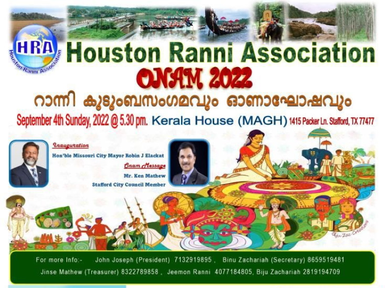 ഹൂസ്റ്റൺ: അമേരിക്കയിലെ പ്രമുഖ പ്രവാസി സംഘടനകളിലൊന്നായ ഹൂസ്റ്റൺ റാന്നി അസോസിയേഷന്റെ (എച്ച്ആർഎ) ആഭിമുഖ്യത്തിൽ ഓണാഘോഷവും കുടുംബസംഗമവും വിപുലമായ പരിപാടികളോടെ നടത്തുന്നു.