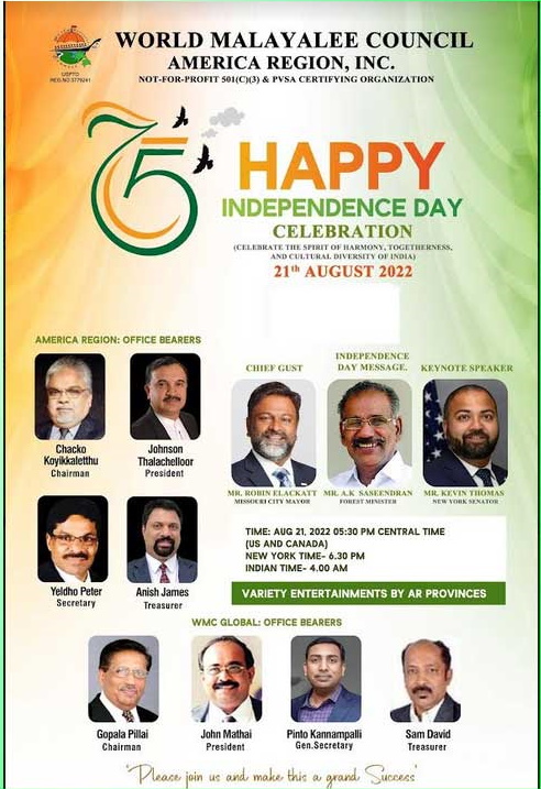 ഡാലസ്: വേൾഡ് മലയാളി കൗൺസിൽ അമേരിക്ക റീജിയൻ ഇന്ത്യയുടെ 75-ാമത് സ്വാതന്ത്ര്യ ദിനാഘോഷം വിപുലമായ പരിപാടികളോടെ സംഘടിപ്പിച്ചു. ‘സൂം’ പ്ലാറ്റ് ഫോമിൽ നടത്തപ്പെട്ട ആഘോഷങ്ങൾ ആഗസ്റ്റ് 21 നു ഞായറാഴ്ച വൈകിട്ടു 6:30 നു (ന്യൂയോർക്ക് സമയം) ആരംഭിച്ചു.