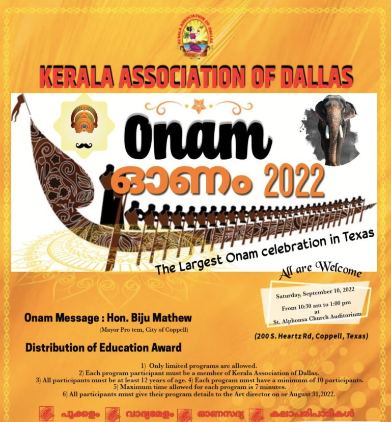 ഓർമ്മിക്കാനും ഓർമ്മകൾ പങ്കുവയ്ക്കാനുമുള്ളതുമാണല്ലോ ഓരോ ഓണവും. ഏഴുകടൽ കടന്നു ഈ നാട്ടിൽ കഴിയുന്ന നമ്മുടെ സമൂഹം അത്തപ്പത്തോണത്തിൻ പൂവിളികൾക്കൊപ്പം ഗൃഹാതുരത്വതയുണർത്തൂന്ന ഓണാഘോഷത്തിനായും പരസ്പരം ആശംസകൾ നേരാനായും ഒരുങ്ങിയിരിക്കുന്നു. മഹാമാരി മൂലം കഴിഞ്ഞ രണ്ടു വര്ഷം ആഘോഷമില്ലാതെ കടന്നു പോയി. ആ നടക്കാതെ പോയ ഓണാഘോഷത്തെ വിസ്മൃതിയിലേക്കു മാറ്റുവാൻ പൂർവ്വാധികം ഊർജ്ജസ്വലതയോടെ, ചിത്തങ്ങളാനന്ദപൂരിതമാക്കാൻ കേരള അസോസിയേഷൻ ഓഫ് ഡാളസ് ഓണപരിപാടികൾ ഒരുക്കിയിരിക്കുന്നു. മുഖ്യാഥിതിയായി കോപ്പേൽ പ്രൊ ടെം മേയർ ബിജു മാത്യു പങ്കെടുത്ത് തിരുവോണ സന്ദേശം നൽകും. ഇത്തവണത്തെ പ്രത്യേക പരിപാടികളായി അത്തപ്പൂക്കളം മത്സരം നടത്തുന്നു. വിജയിക്ക് പ്രത്യേക പരിതോഷികം നൽകും.