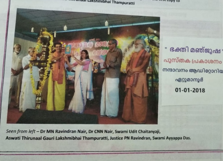 അദ്ദേഹത്തിന്റെ ജന്മദേശമായ ഏറ്റുമാനൂരിലെ നന്ദാവനം ഓഡിറ്റോറിയത്തിൽ ഔപചാരികമായി നടത്തിയ ചടങ്ങിൽ വച്ച് അശ്വതി തിരുനാൾ ഗൗരി ലക്ഷ്മീഭായ് തമ്പുരാട്ടി, സ്വാമി ഉദിത് ചൈതന്യയുടെയും സ്വാമി അയ്യപ്പദാസ് ന്റെയും സമക്ഷത്തിൽ പ്രകാശനം ചെയ്ത ഈ മഹദ് ഗ്രന്ഥം,ആത്മീയ ലോകത്തിനു ഒരു മുതൽക്കൂട്ട് മാത്രമല്ല, ഇത് ഭദ്രമായി സൂക്ഷിക്കുന്ന ഭവനങ്ങൾക്ക് മംഗള ദായിയുമാണെന്നു നിസ്സംശയം പറയാം. ഈ ഗ്രന്ഥത്തിനു രൂപം കൊടുക്കാൻ അദ്ദേഹം തീർച്ചയായും ഒട്ടേറെ സമയവും ചിന്തയും നിദ്രാവിഹീനങ്ങളായ രാത്രികളും ചിലവഴിച്ചിരിക്കുമെന്നത് പകൽപോലെ ജ്വലിക്കുന്ന സത്യം!