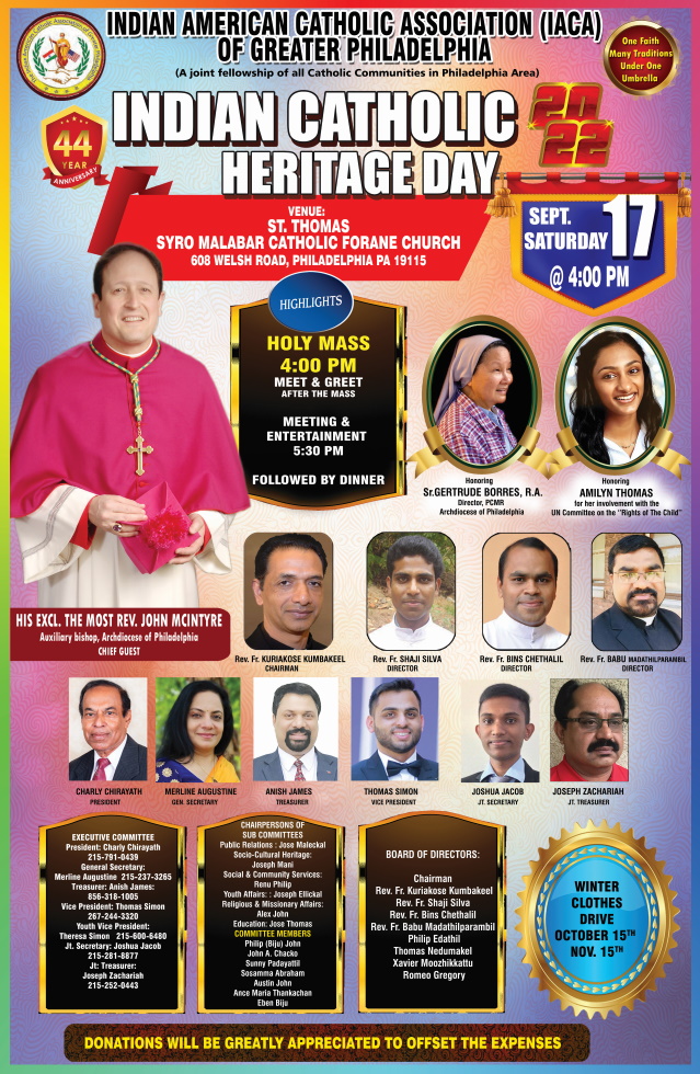 കേരളീയ ക്രൈസ്തവപൈതൃകവും, പാരമ്പര്യങ്ങളും അമേരിക്കയിലും അഭംഗുരം കാത്തുസൂക്ഷിക്കുന്ന സീറോമലബാര്, സീറോമലങ്കര, ക്നാനായ, ലത്തീന് എന്നീ ഭാരതീയകത്തോലിക്കര് ഒരേ വിശ്വാസം, പല പാരമ്പര്യങ്ങള് എന്ന ആപ്തവാക്യത്തിലൂന്നി ഒരേ കുടക്കീഴില് ഒത്തുചേര്ന്ന് ആണ്ടുതോറും നടത്തിവരുന്ന ഇന്ത്യന് കാത്തലിക് ഹെറിറ്റേജ് ഡേ ആഘോഷങ്ങള് ഈ വര്ഷം സെപ്റ്റംബര് 17 നാണ് നടക്കുന്നത്.