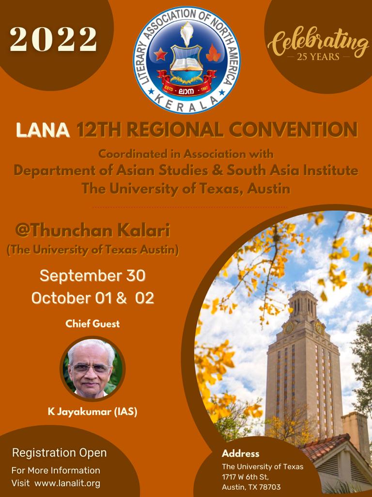 ഓസ്റ്റിൻ,ടെക്സാസ്: ലിറ്റററി അസോസിയേഷൻ ഓഫ് നോർത്ത് അമേരിക്കയുടെ (ലാന) പന്ത്രണ്ടാമത് പ്രാദേശിക സമ്മേളനം സെപ്തംബർ 30, ഒക്ടോബർ 1, 2 തീയതികളിൽ ടെക്സസിലെ ഓസ്റ്റിനിൽ നടക്കും.