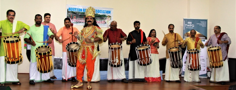 തുടർന്ന് ജനറൽ സെക്രട്ടറി ബിനു സക്കറിയയുടെ നേതൃത്വത്തിലുള്ള ചെണ്ടമേളത്തിന്റെയും വാദ്യഘോഷത്തിന്റെയും അകമ്പടിയോടെ ‘മാവേലി തമ്പുരാനെ” വരവേറ്റു. ഹൂസ്റ്റണിൽ, പകരം വയ്ക്കാനില്ലാത്ത, വർഷങ്ങളായി ‘സൂപ്പർ മാവേലി’യായി മികച്ച പ്രകടനം നടത്തുന്ന റെനി കവലയിൽ ‘മാവേലി തമ്പുരാനെ’ ഉജ്ജ്വലമാക്കി.
