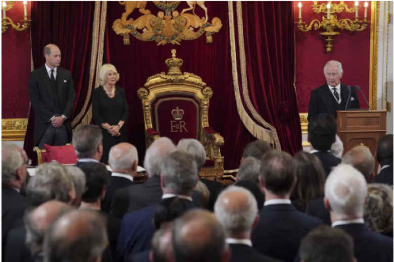 മാതാവിന്റെ മരണശേഷം സിംഹാസനം പാരമ്പര്യമായി ലഭിച്ചെങ്കിലും, രാജാവിന്റെ ഉപദേശക സമിതിയായ പ്രിവി കൗൺസിൽ, ലണ്ടനിലെ സെന്റ് ജെയിംസ് കൊട്ടാരത്തിൽ ഒത്തുകൂടി, ചാൾസ് രാജാവായി പ്രഖ്യാപിച്ച് പ്രവേശന കൗൺസിൽ യോഗത്തിന് തുടക്കമായി.