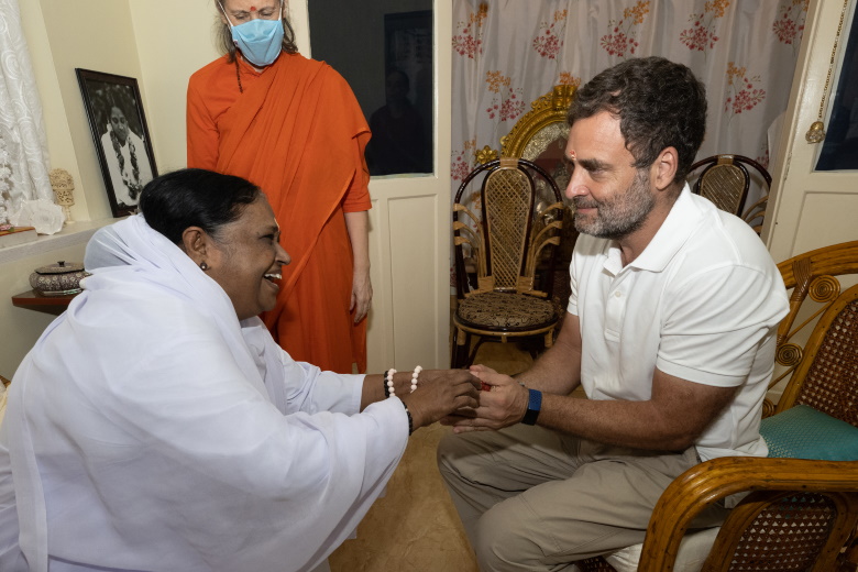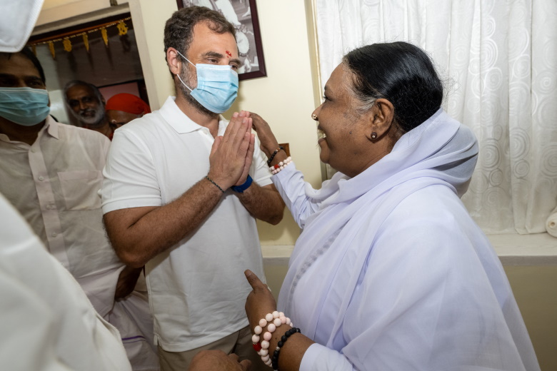 കൊല്ലം: ഭാരത് ജോഡോ യാത്രയുടെ ഭാഗമായി കൊല്ലം ജില്ലയിലെത്തിയ കോൺഗ്രസ് നേതാവ് രാഹുൽ ഗാന്ധി മാതാ അമൃതാനന്ദമയി ദേവിയെ സന്ദർശിച്ചു. വെള്ളിയാഴ്ച രാത്രി എട്ടരയോടെയാണ് രാഹുൽ അമൃതപുരിയിലെ മാതാ അമൃതാനന്ദമയി മഠത്തിലെത്തിയത്. മഠത്തിലെ ബ്രഹ്മചാരിമാർ രാഹുലിനെ സ്വീകരിച്ചു. തുടർന്ന് 45 മിനിറ്റോളം അമ്മയുമൊത്ത് സംസാരിച്ചു.