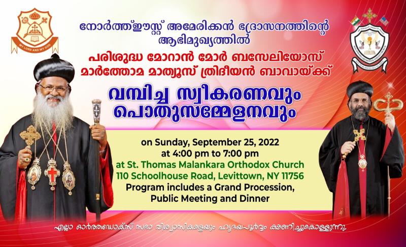 ശ്ലൈഹിക സന്ദർശനത്തിനായി അമേരിക്കയിൽ എത്തുന്ന മലങ്കര ഓർത്തഡോക്സ് സഭയുടെ കാതോലിക്കയും പരമാദ്ധ്യക്ഷനുമായ മോറോൻ മാർ ബസേലിയോസ് മാർത്തോമാ മാത്യൂസ് തൃതീയന് നോർത്ത് ഈസ്റ്റ് അമേരിക്കൻ ഭദ്രാസനം വമ്പിച്ച സ്വീകരണം നൽകുന്നു.