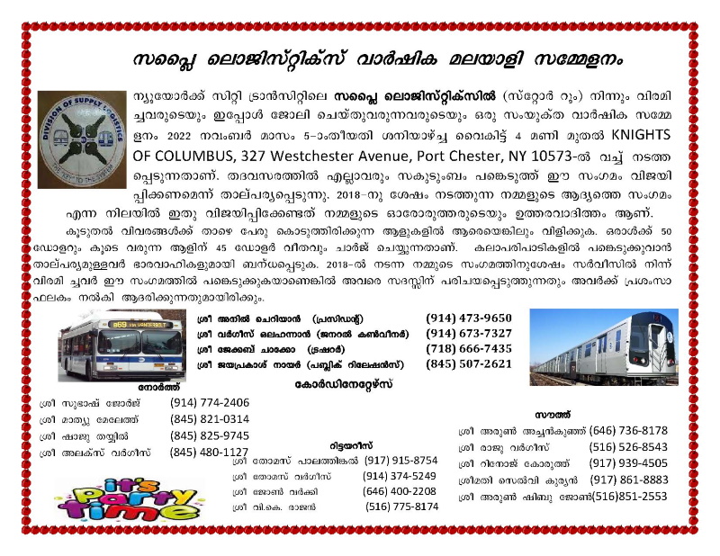ന്യൂയോർക്ക്: ന്യൂയോർക്ക് സിറ്റി ട്രാൻസിറ്റിലെ സപ്ലൈ ലോജിസ്റ്റിക്സിലുള്ള മലയാളികളായ ഉദ്യോഗസ്ഥരുടേയും, സർവീസിൽ വിരമിച്ചവരുടെയും കുടുംബ സംഗമം 2022 നവംബർ 5 ശനിയാഴ്ച വൈകീട്ട് 4 മണിക്ക് പോർട്ട്ചെസ്റ്ററിലെ നൈറ്റ്സ് ഓഫ് കൊളംബസ്സിൽ (327 വെസ്റ്റ്ചെസ്റ്റർ അവന്യു) വെച്ച് നടക്കുന്നതാണ്.
