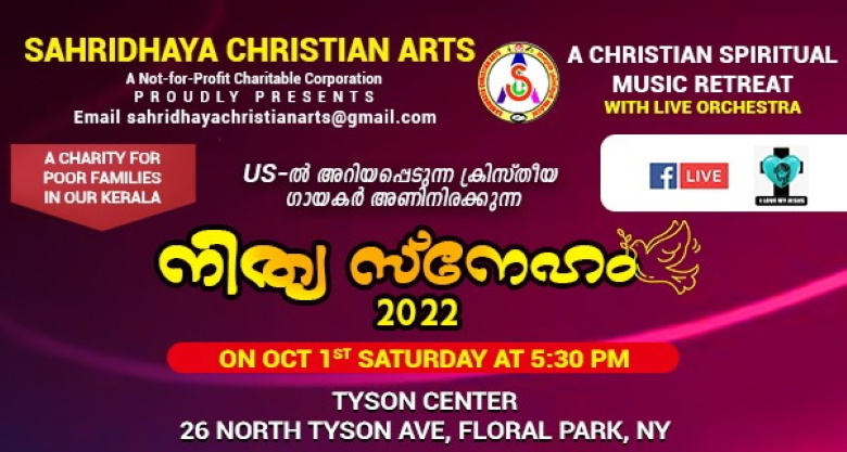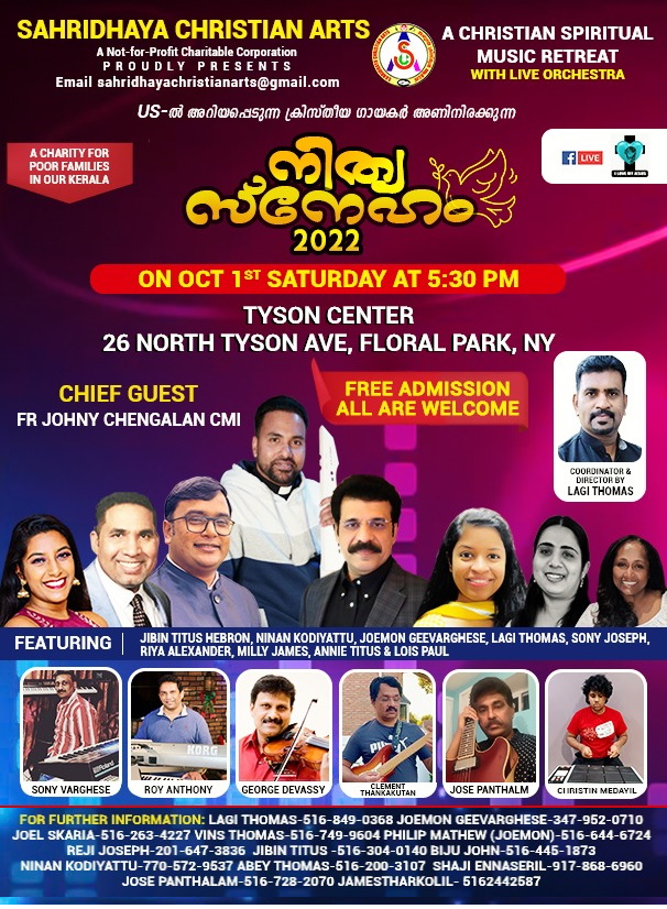 ന്യൂയോർക്ക്: സഹ്യദയ ക്രിസ്ത്യൻ ആർട്സ് ഒരുക്കുന്ന ക്രിസ്ത്യൻ മ്യൂസിക്കൽ നൈറ്റ് “നിത്യ സ്നേഹം 2022” ഒക്ടോബർ ഒന്നിന് ശനിയാഴ്ച വൈകിട്ട് 5.30 ന് ടൈസൺ സെൻറ്ററിൽ (26 N Tyson Ave, Floral Park, NY) വച്ചു നടത്തപ്പെടുന്നു. അമേരിക്കയിൽ അറിയപ്പെടുന്ന ഗായകർ അണിനിരക്കുന്ന ഈ ആത്മീക സംഗീത കൂട്ടായ്മയിൽ ലൈവ് ഓർക്കസ്ട്രയുടെ അകമ്പടിയോടു കൂടെയാണ് നടത്തപ്പെടുന്നത്. ഈ പ്രോഗ്രാമിലെ മുഖ്യ അതിഥിയായി ഫാദർ ജോണി ചെങ്ങളം പങ്കടുക്കുന്നു.