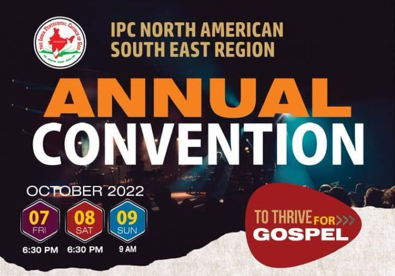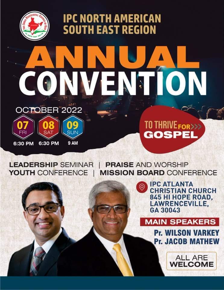 ഫ്ളോറിഡ: ഐപിസി നോർത്ത് അമേരിക്കൻ സൗത്ത് ഈസ്റ്റ് റീജിയൻ വാർഷിക കൺവൻഷനും ഭാരവാഹികളുടെ തിരഞ്ഞെടുപ്പും ഒക്ടോബർ 7 വെള്ളി, 8 ശനി, 9 ഞായർ ദിവസങ്ങളിൽ ഐ.പി.സി അറ്റ്ലാന്റാ ക്രിസ്ത്യൻ ചർച്ചിൽ (IPC Atlanta Christian Church, 845 Hi Hope Road , Lawrenceville,Ga 30043 ) വെച്ച് നടത്തപ്പെടും. പാസ്റ്റർ വിൽസൻ വർക്കിയും പാസ്റ്റർ ജേക്കബ് മാത്യൂവും വിവിധ ദിവസനങ്ങളിൽ മുഖ്യ പ്രഭാഷണം നടത്തും. ഞയറാഴ്ച സംയുക്ത സഭാ ആരാധനയും തിരുവത്താഴ ശുശ്രുഷയും ഉണ്ടായിരിക്കും.