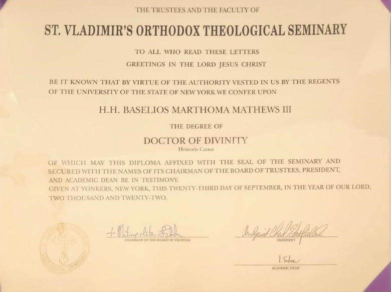 മലങ്കര ഓർത്തഡോൿസ് സഭയുടെ കാതോലിക്കയും മലങ്കര മെത്രാപ്പോലീത്തയുമായ മോറോൻ മാർ ബസേലിയോസ് മാർത്തോമാ മാത്യൂസ് തൃതീയന് അമേരിക്കയിലെ പ്രശസ്ത വൈദിക സെമിനാരി ആയ സെന്റ്. വ്ളാഡിമിർ ഓർത്തഡോൿസ് തിയളോജിക്കൽ സെമിനാരി ഡോക്ടറേറ്റ് ബിരുദം നൽകി ആദരിച്ചു