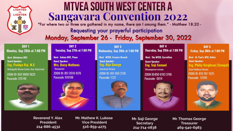 ഡാളസ്: മാർത്തോമാ വോളണ്ടറി ഇവാഞ്ചലിസ്റ്റിക് അസോസിയേഷൻ (MTVEA) സൗത്ത് വെസ്റ്റ് സെന്റർ എ യുടെ ആഭിമുഖ്യത്തിൽ വർഷം തോറും നടത്തി വരുന്ന സാംഘ വാര കൺവെൻഷൻ ഈ വർഷവും സൂം പ്ലാട്ഫോമിൽ കൂടി നടത്തപ്പടും.