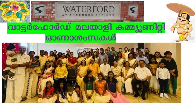 ഹ്യൂസ്റ്റണ്: ഹ്യൂസ്റ്റനിലെ മിസ്സൗറി സിറ്റിയിലുള്ള, സിയന്നാ പ്ലാന്റ്റേഷന്, വാട്ടര്ഫോര്ഡ് മലയാളി കമ്മ്യൂണിറ്റി, സെപ്റ്റംബര് 24നു അപ്നാ ബസാര് ഓഡിറ്റോറിയത്തില് വച്ച് ഓണം ആഘോഷിച്ചു. കമ്മ്യൂണിറ്റി നിവാസികളുടെ കേരള തനിമയാര്ന്ന ഓണാഘോഷം അത്യന്തം വര്ണശബളവും ആകര്ഷകവുമായി. പരമ്പരാഗത കേരളീയ ഓണക്കാല വസ്ത്രധാരികളായി എത്തിയ വാട്ടര്ഫോര്ഡ് മലയാളി കമ്മ്യൂണിറ്റി സമൂഹ നിവാസികള് ഓഡിറ്റോറിയത്തില് ആഘോഷത്തിനും ആമോദത്തിനും തരംഗമാലകള് തന്നെ സൃഷ്ടിച്ചു. വാട്ടര്ഫോര്ഡ് മലയാളി മങ്കമാര് അതികമനീയമായി തീര്ത്ത പൂക്കളത്തിനു ചുറ്റും, ഓണത്തുമ്പികളേയും പൂമ്പാറ്റകളെയും പോലെ മലയാളി പൈതങ്ങള് ആവേശത്തോടെ ഓടി കളിച്ചപ്പോള് കേരളത്തിലെങ്ങോ ഓണക്കാലത്തു മുറ്റത്ത് തീര്ത്ത പൂക്കളത്തിനു ചുറ്റും ബാലികാ ബാലന്മാര് വട്ടമിട്ട് ആര്ത്തുല്ലസിക്കുന്ന ഒരു പ്രതീതിയാണുണ്ടായത്.