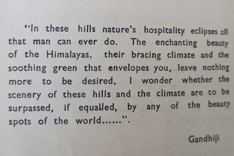 ഇവിടുത്തെ മനോഹരമായ കുന്നുകൾ കാണുമ്പോൾ എന്റെ എല്ലാ സങ്കടങ്ങളും വേദനകളും ഞാൻ മറക്കുന്നുവെന്ന് മുസ്സൂറിയെക്കുറിച്ച് ഗാന്ധി പറയാറുണ്ടായിരുന്നു. മുസ്സൂറി ആൻഡ് ഡൂൺ ഗൈഡ്ബുക്കിന്റെ മുൻ പേജിലെ ഗാന്ധിജിയുടെ ലേഖനത്തിലും ഇക്കാര്യം പരാമർശിച്ചിട്ടുണ്ട്, ഭരദ്വാജ് അനുസ്മരിച്ചു. ഭരണാധികാരികളെ കാൽനടയായി ഈ ഹിൽസ്റ്റേഷനിലേക്ക് കൊണ്ടുപോകുന്ന ചുമട്ടുതൊഴിലാളികളുടെ ദുരവസ്ഥയിൽ മഹാത്മാഗാന്ധിയും ആശങ്കാകുലനായിരുന്നുവെന്ന് മുസ്സൂറി ഹെറിറ്റേജ് സെന്ററിലെ സുർഭി അഗർവാൾ പറഞ്ഞു. 1946 ജൂണിൽ സിൽവർട്ടൺ ഗ്രൗണ്ടിൽ ഒരു ആഴ്ച നീണ്ടുനിൽക്കുന്ന പ്രാർത്ഥനായോഗം കൂടിയപ്പോൾ ഗാന്ധിജി രണ്ടാമതും മുസ്സൂറി സന്ദർശിച്ചു.
