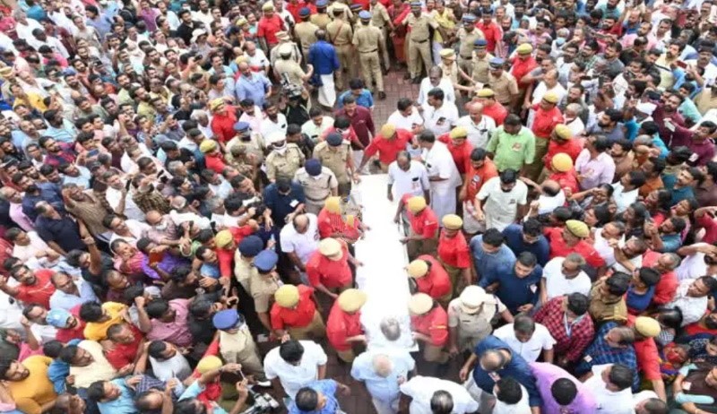 ജനസാഗരമായി തലശേരി : ചേതനയറ്റ ശരീരം അവരുടെ മുന്നിലൂടെ കടന്നുപോയപ്പോൾ അണികൾ ഉറക്കെ മുദ്രാവാക്യം വിളിക്കുകയായിരുന്നു. ജനങ്ങളും നേതാക്കളുമെല്ലാം ഹൃദയം തൊട്ട് വിതുമ്പുന്ന കാഴ്ചയാണ് മട്ടന്നൂർ വിമാനത്താവളം മുതൽ തലശേരി ടൗൺ ഹാൾ വരെ കണ്ടത്. നിറഞ്ഞ കണ്ണുകളുമായി നിന്നവരെല്ലാം ഹൃദയവേദനയിലും മുഷ്ടി ചുരുട്ടി ചങ്ക് പിളർക്കെ ‘ഇല്ല..ഇല്ല..മരിക്കുന്നില്ല..കോടിയേരി മരിക്കുന്നില്ല’ എന്ന് ഓരോ നിമിഷത്തിലും ഉറക്കെ വിളിച്ചുകൊണ്ടേയിരുന്നു.
