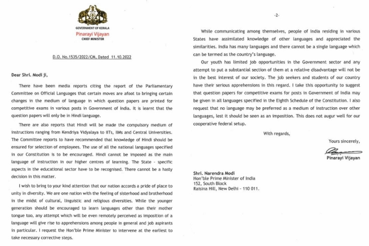 ഏതെങ്കിലും ഒരു ഭാഷയെ മറ്റു ഭാഷകൾക്ക് മുകളിൽ അവരോധിക്കുന്നത് ഈ അഖണ്ഡതയെ തകർക്കും. വിദ്യാഭ്യാസത്തിൻ്റെ കാര്യത്തിൽ സംസ്ഥാനങ്ങൾക്കുള്ള സവിശേഷതകൾ അംഗീകരിക്കേണ്ടതുണ്ട്. തൊഴിൽ പരീക്ഷകൾ ഹിന്ദിയിലാക്കുന്നത് രാജ്യത്തെ ഒരു വലിയ ശതമാനം ചെറുപ്പക്കാർക്ക് തൊഴിൽ നിഷേധിക്കപ്പെടാൻ കാരണമാകും. മാത്രമല്ല, ഹിന്ദി അടിച്ചേൽപ്പിക്കുന്നത് സഹകരണാത്മക ഫെഡറലിസത്തിന്റെ തത്വത്തിന് എതിരാണ്. ഈ കാരണങ്ങളാൽ ഹിന്ദി നിര്ബ്ബന്ധിത പഠന ഭാഷയാക്കാനുള്ള പഠിപ്പിക്കാനുള്ള ശ്രമത്തിൽ നിന്ന് കേന്ദ്ര സർക്കാർ പിന്മാറണമെന്നും മുഖ്യമന്ത്രി കത്തിൽ ആവശ്യപ്പെട്ടു.