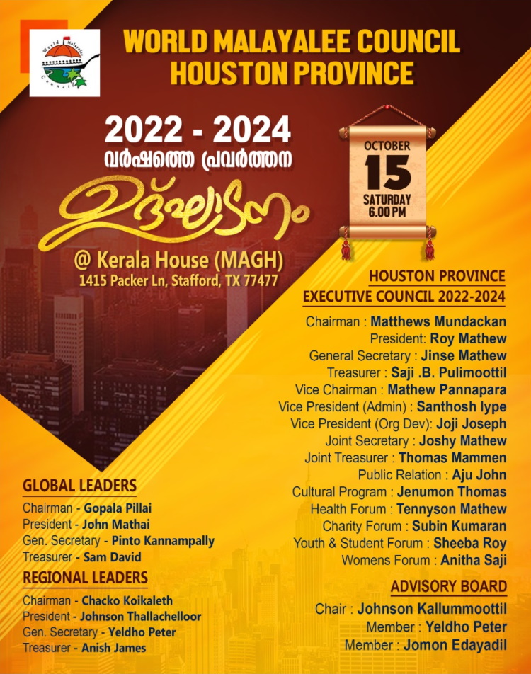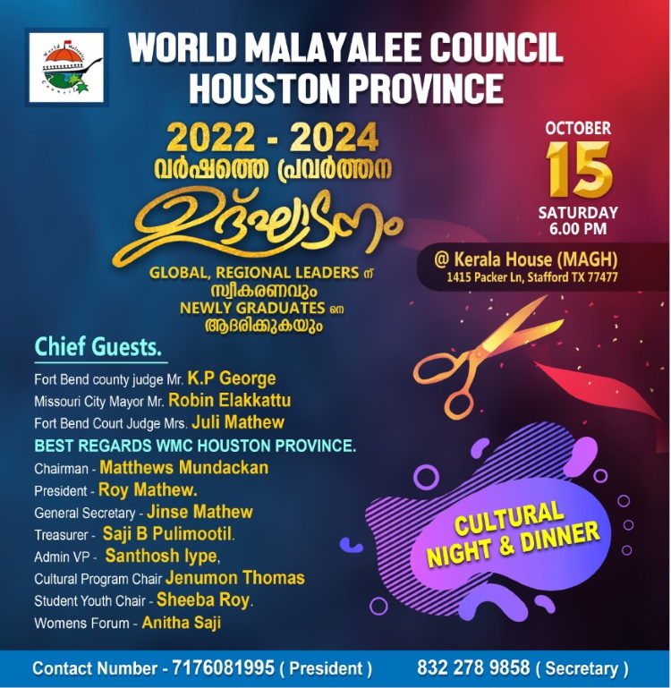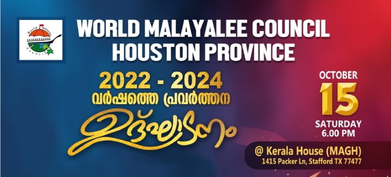 ഹ്യൂസ്റ്റണ്: വേൾഡ് മലയാളി കൗൺസിൽ ഹ്യൂസ്റ്റണ് പ്രോവിൻസ് 2022 -2024 പ്രവർത്തന ഉദ്ഘാടനം 2022 ഒക്ടോബർ 15 ശനിയാഴ്ച വൈകുന്നേരം 6 മണിക്ക് സ്റ്റാഫോര്ർഡിലുള്ള മലയാളി അസ്സോസിയേഷന് ഓഫ് ഗ്രെയ്റ്റര് ഹ്യൂസ്റ്റണ് ആസ്ഥാന കേന്ദ്രമായ കേരള ഹൗസിൽ (1415 Packer Ln, Stafford, TX 77477 ) നടത്തപ്പെടും.