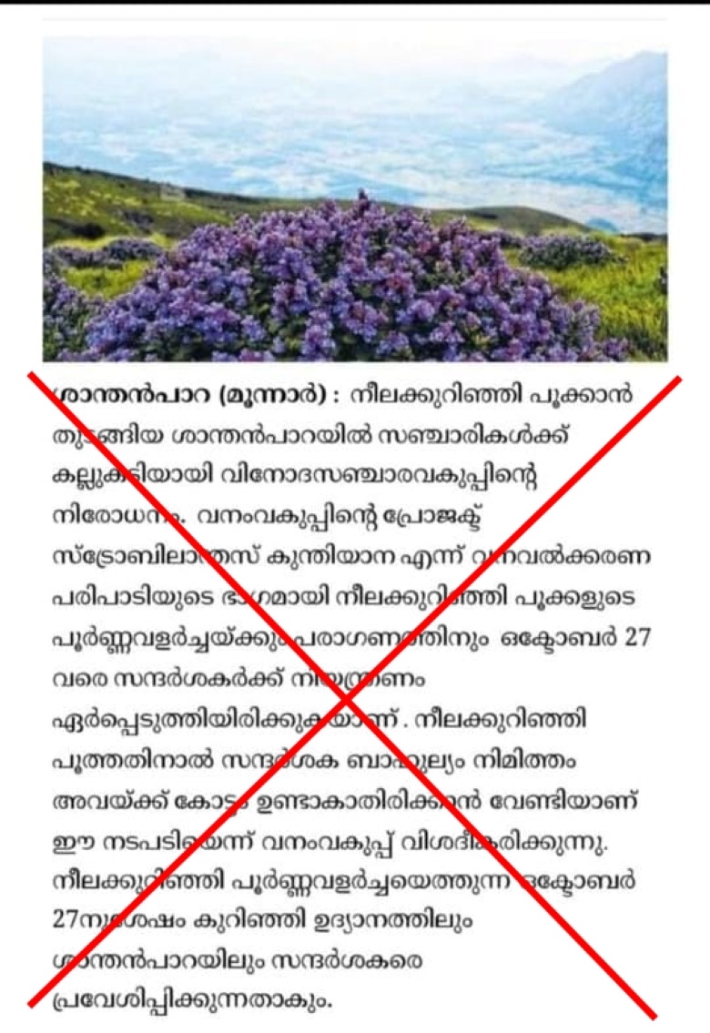 സാമൂഹ്യ വന വത്കരണ പരിപാടിയുടെ ഭാഗമായി കുറിഞ്ഞി സംരക്ഷണം ലക്ഷ്യം വച്ച് വനം വകുപ്പ് സന്ദര്ശനം നിരോധിച്ചിരിക്കുകയാണെന്ന വാര്ത്തകളും സ്ക്രീന്ഷോട്ടുകളുമാണ് പ്രചരിക്കുന്നത്. അതേസമയം വന്യ മൃഗങ്ങള് സ്വൈര്യവിഹാരം നടത്തുന്ന മേഖലയായതിനാല് വൈകുന്നേരം അഞ്ചരയ്ക്ക് ശേഷം ഇവിടേയ്ക്ക് പ്രവേശനം അനുവദിയ്ക്കില്ല എന്നത് മാത്രമാണ് ഏക നിയന്ത്രണമായുള്ളത്.